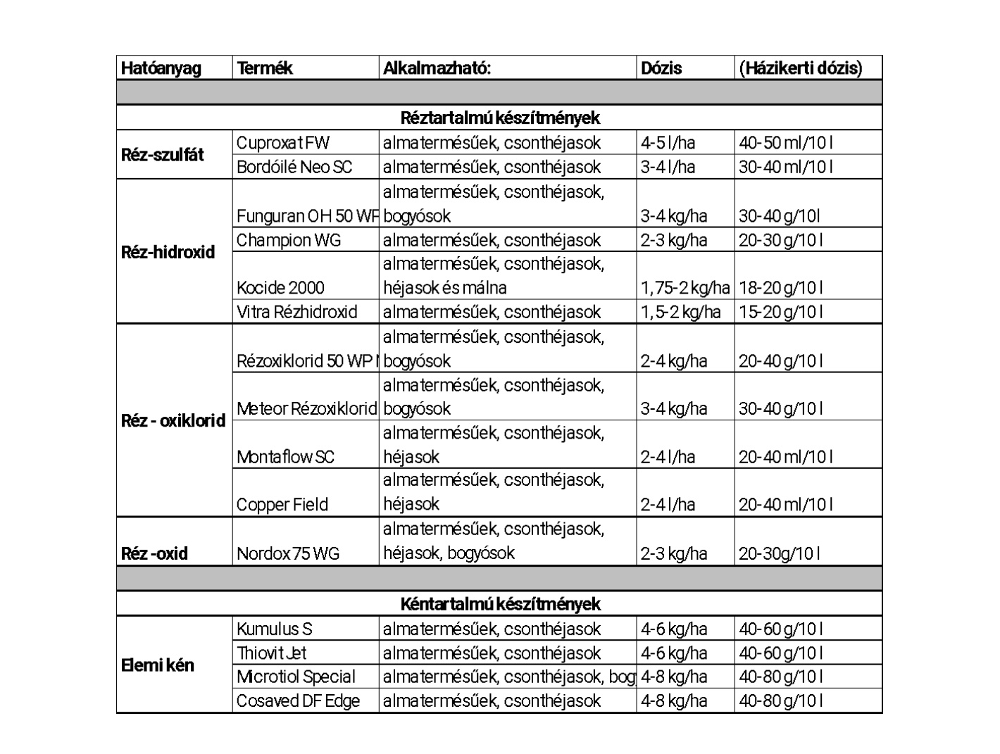 Válasszuk ki a listából bármelyik rendelkezésre álló réz és kén tartalmú szert és együttesen juttassuk ki! (A felsorolt szerek bioban is felhasználhatók, valamint a legtöbbjük szőlőben is engedélyezett.)